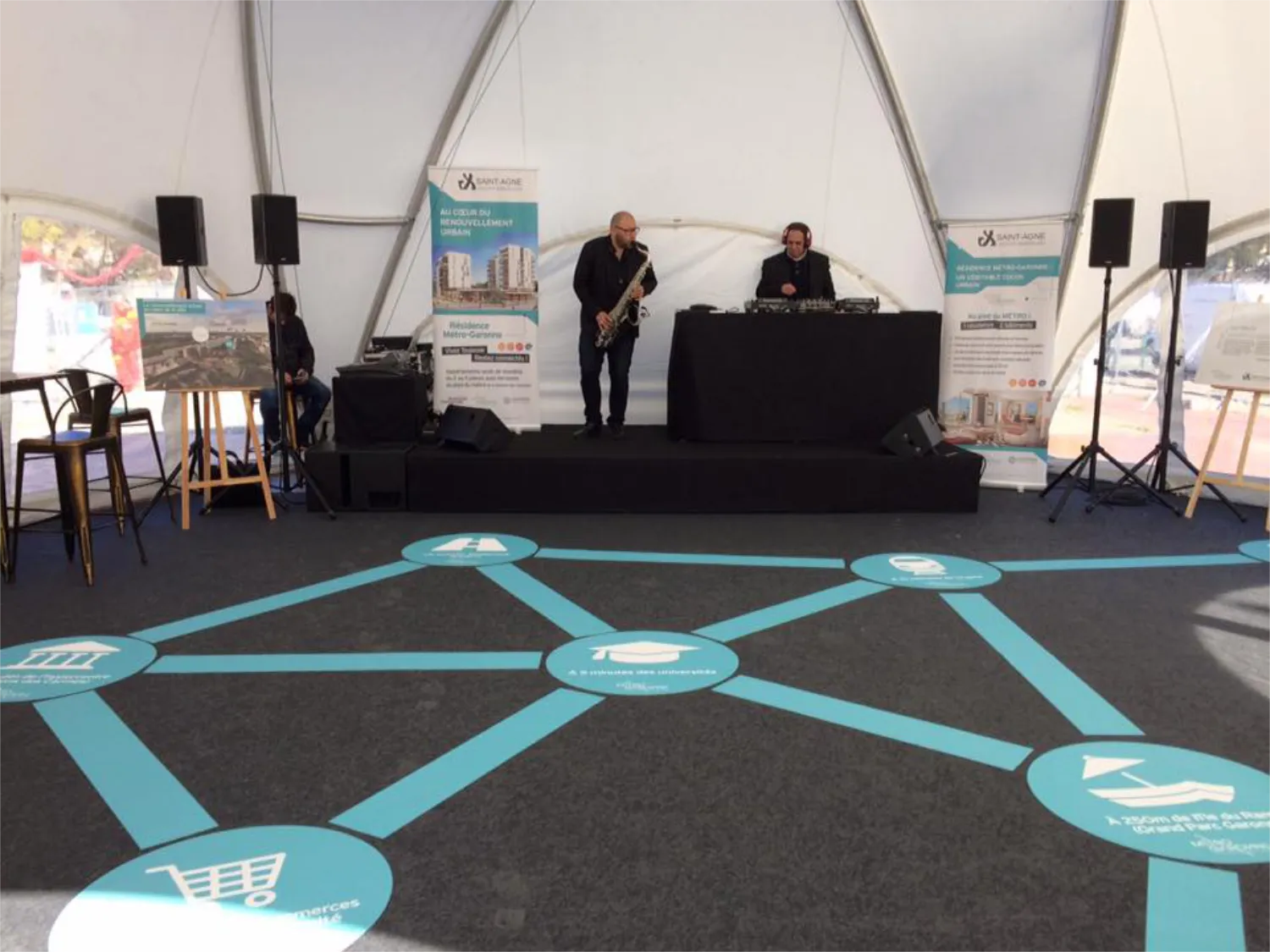 Polyvalente, la moquette événementielle s’adapte à de nombreux environnements : halls d’exposition, salons, stands, scènes, espaces d’accueil ou zones lounge. Elle peut être utilisée seule ou en complément d’autres revêtements de sol, comme les scènes ou parquets événementiels, afin de créer une scénographie cohérente et élégante.
